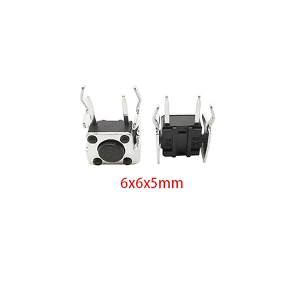 Este pack incluye 10 unidades de pulsadores táctiles (tact switch) con un diseño de ángulo recto, perfectos para montaje en placas de circuito impreso (PCB).