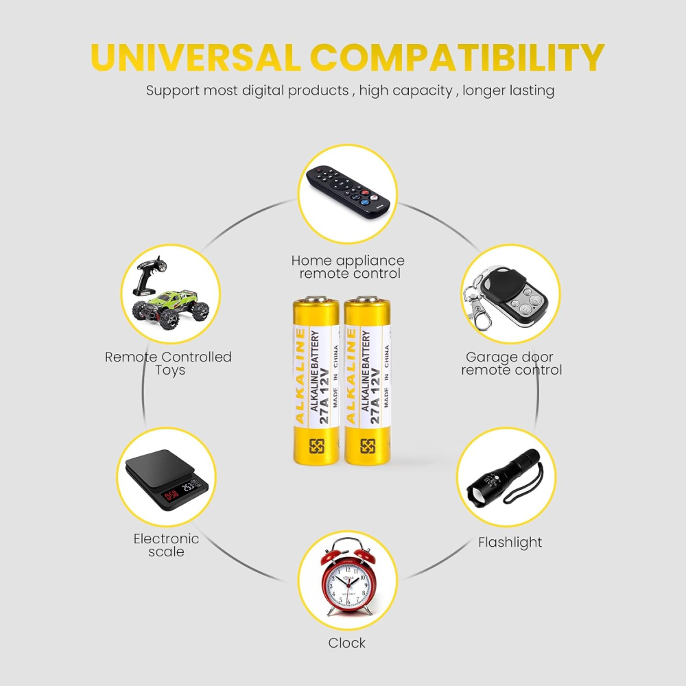 Gracias a su voltaje, es la opción perfecta para equipos que requieren una señal potente a distancia, como mandos de puertas de garaje, sistemas de alarma de vehículos, timbres inalámbricos y otros controles remotos.