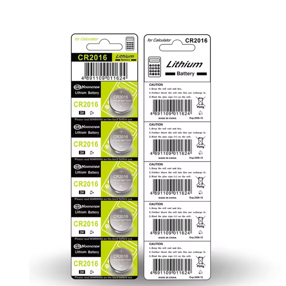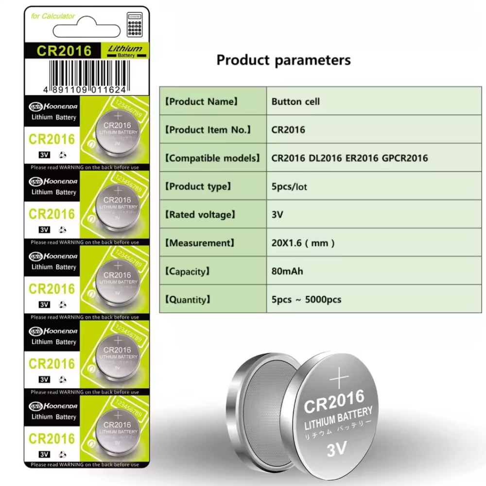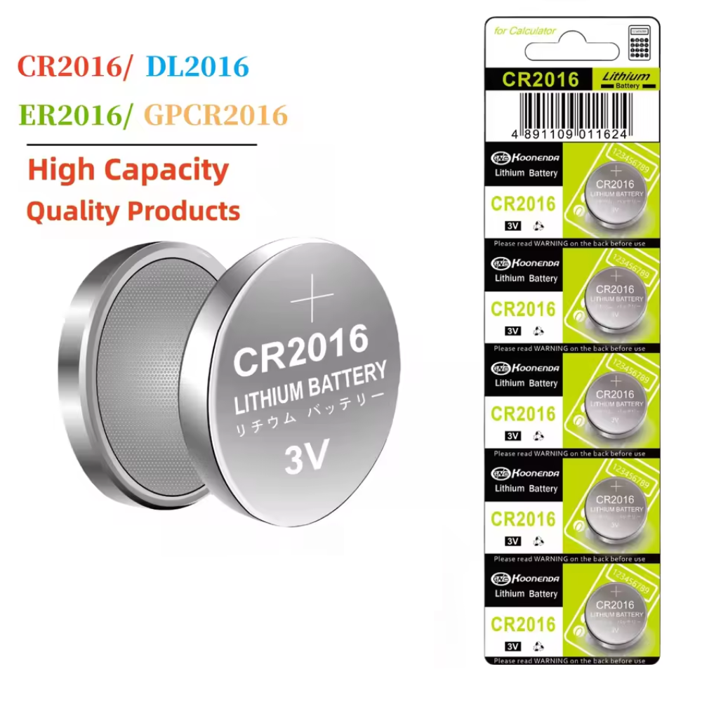 Pack de 5 pilas de botón CR2016 de litio marca Koonenda. Ofrecen un voltaje estable de 3 V y una capacidad de 80 mAh. Ideales para mandos, relojes y pequeños dispositivos.