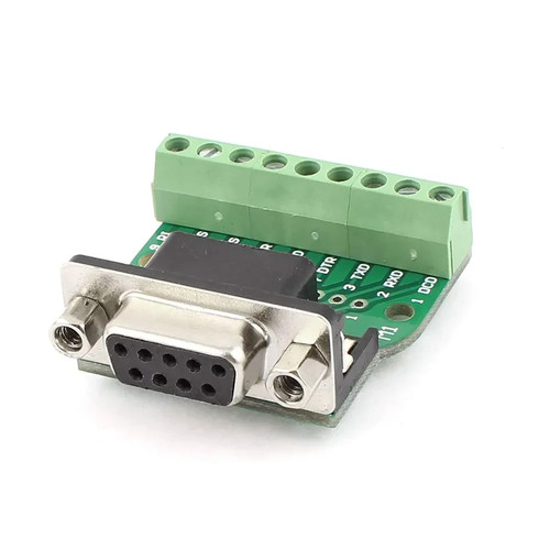 Este adaptador convierte un conector DB9 hembra estándar en una bornera de tornillos de 9 pines, facilitando la conexión de cables individuales sin necesidad de soldadura.
