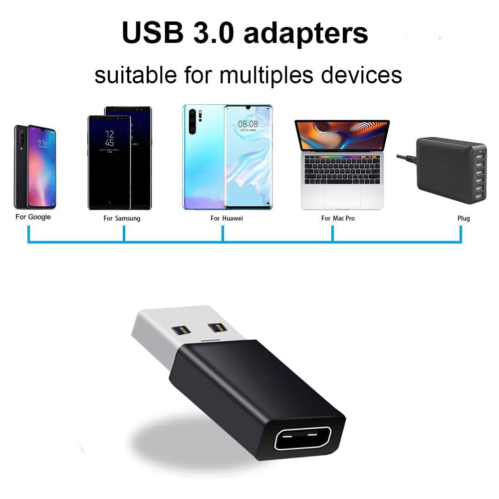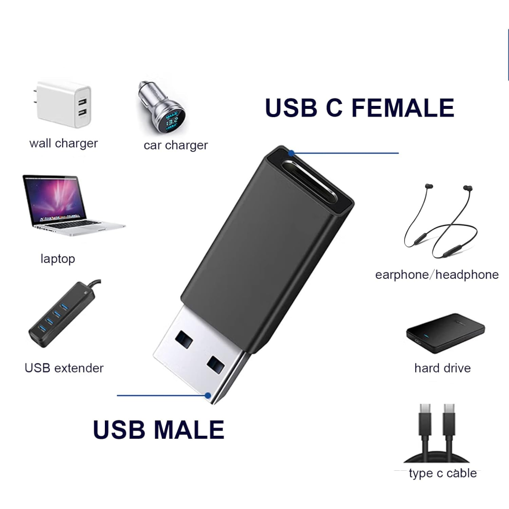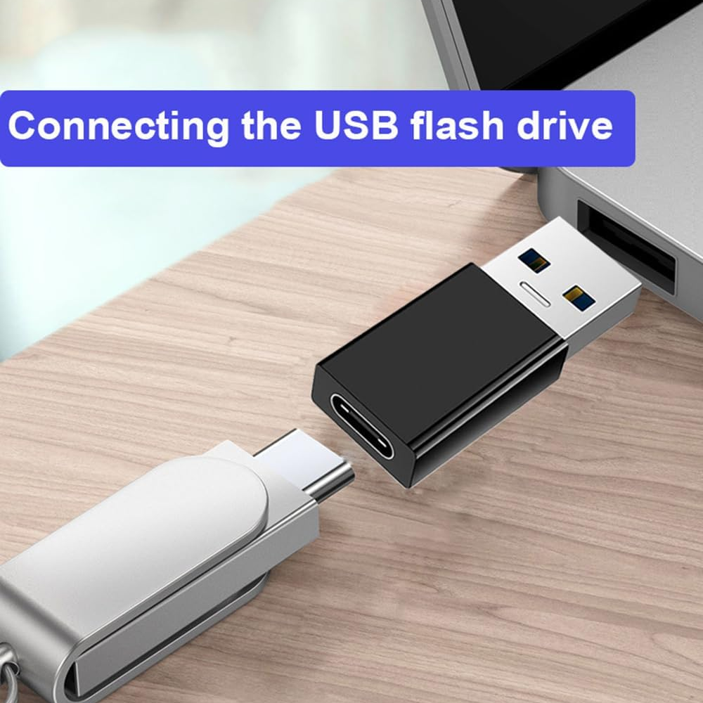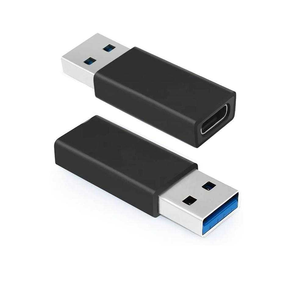 Este adaptador convierte un puerto USB-A macho estándar en un conector USB-C hembra, permitiendo conectar periféricos como pendrives, teclados o ratones a dispositivos con puerto USB-C.