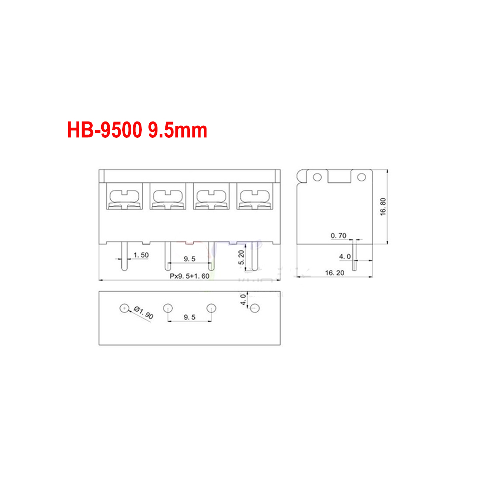Bornera de barrera HB-9500 de 2 pines para montaje en PCB. Con un paso de 9.5 mm y capacidad para 300 V / 20 A, proporciona una conexión de potencia compacta y segura. Incluye cubierta protectora transparente y tornillos M3, ideal para cables de 22-14 AWG en aplicaciones industriales.
