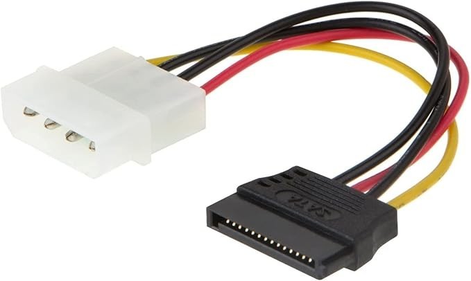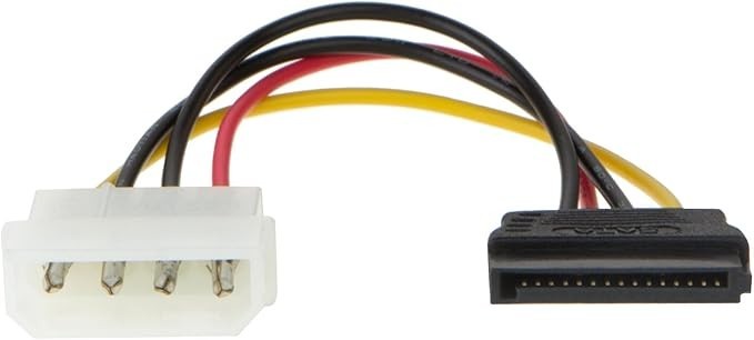 Este cable adaptador convierte un conector de alimentación MOLEX de 4 pines, presente en fuentes de alimentación más antiguas, a un conector de alimentación SATA de 15 pines.