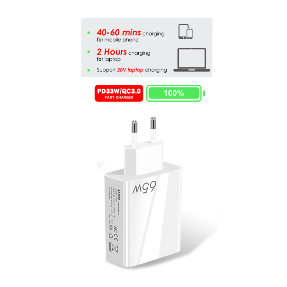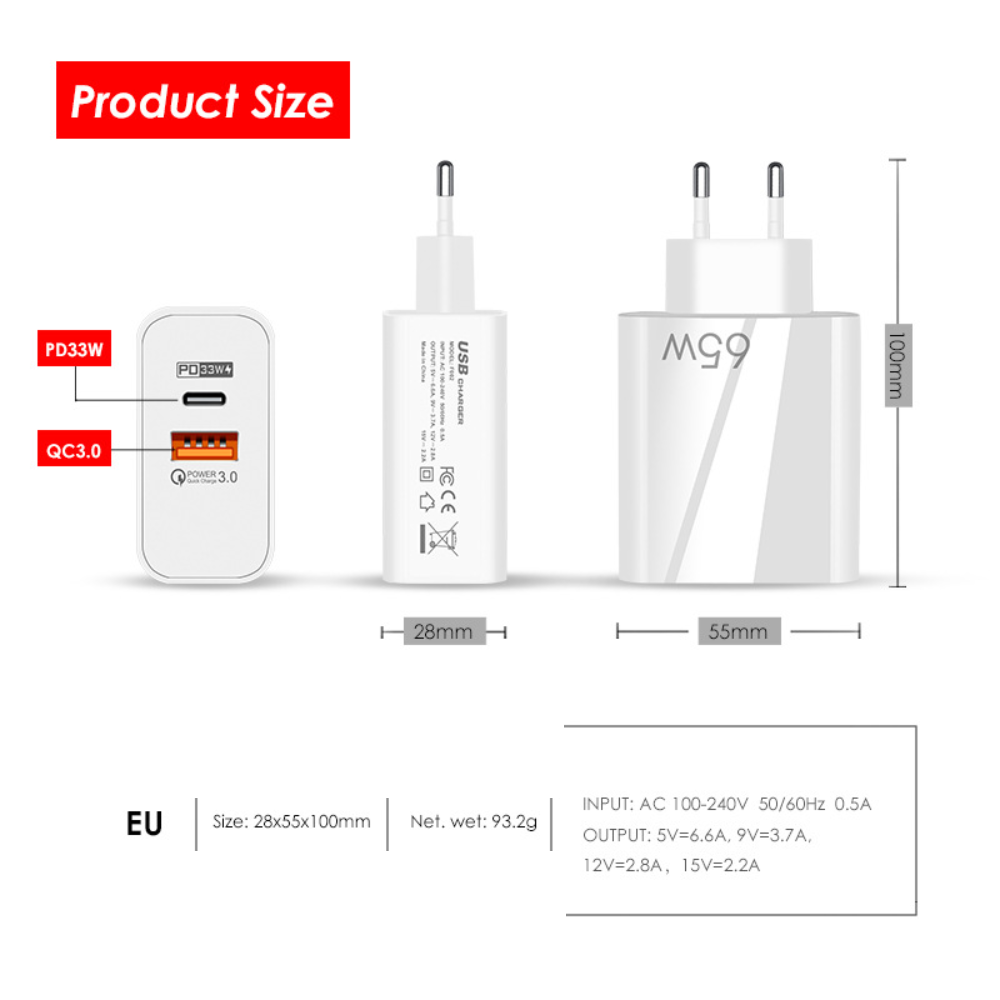 - 1x Cargador GaN 65W Carga Rápida Doble Puerto USB-C PD y USB-A QC 3.0 Blanco