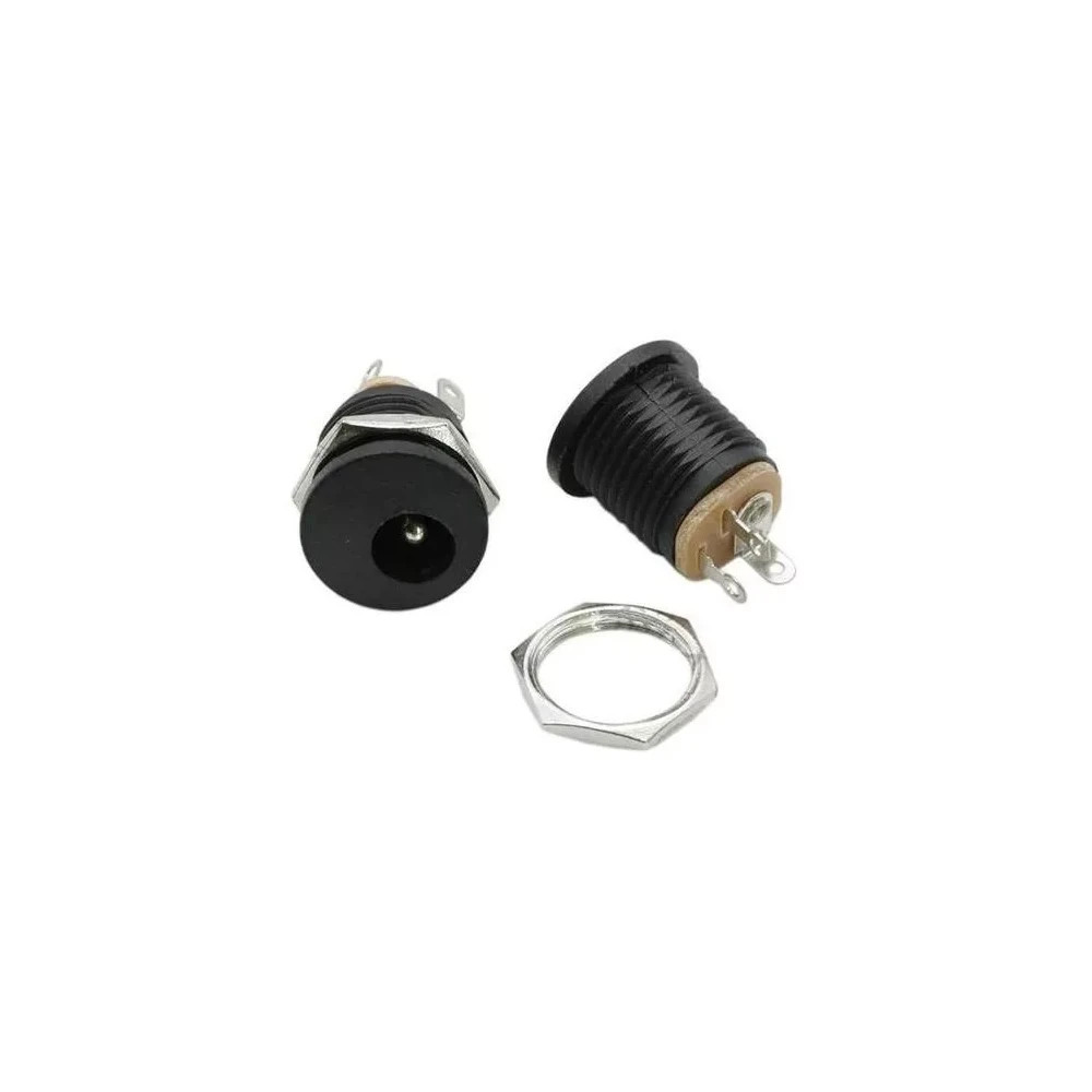 Este modelo cuenta con un diámetro exterior de 5.5 mm y un pin central de 2.5 mm, lo que lo hace compatible con una amplia variedad de fuentes de alimentación. Incluye una tuerca hexagonal y una arandela de fijación que aseguran el componente firmemente a la superficie, evitando que se mueva o se hunda al insertar el conector macho. Sus tres terminales de soldadura están claramente diferenciados para facilitar la conexión eléctrica.