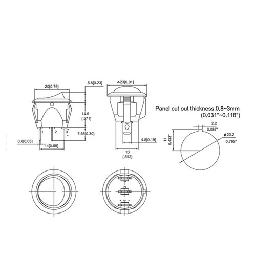 Este interruptor basculante redondo está diseñado para una fácil instalación en paneles, requiriendo un orificio de 20 mm de diámetro.