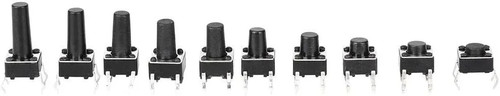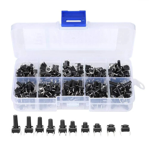 Este kit es una solución completa para cualquier proyecto de electrónica, reparación o prototipado. Incluye un total de 200 pulsadores táctiles (microinterruptores) del popular tamaño 6×6 mm, presentados en 10 alturas de vástago diferentes para adaptarse a cualquier necesidad de montaje en placas de circuito impreso (PCB).