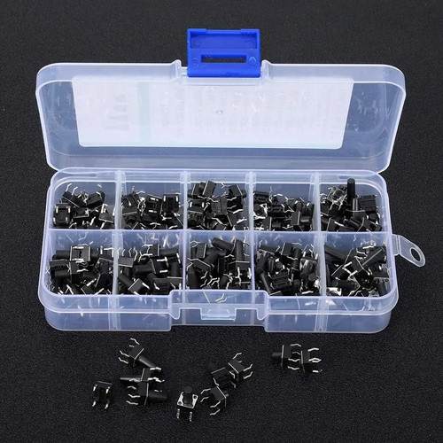 Cada pulsador cuenta con una configuración de 4 pines para una sujeción estable y un funcionamiento momentáneo fiable (SPST-NO). El kit se entrega en una práctica caja de plástico con compartimentos, que facilita la organización y el acceso rápido a cada uno de los tamaños.