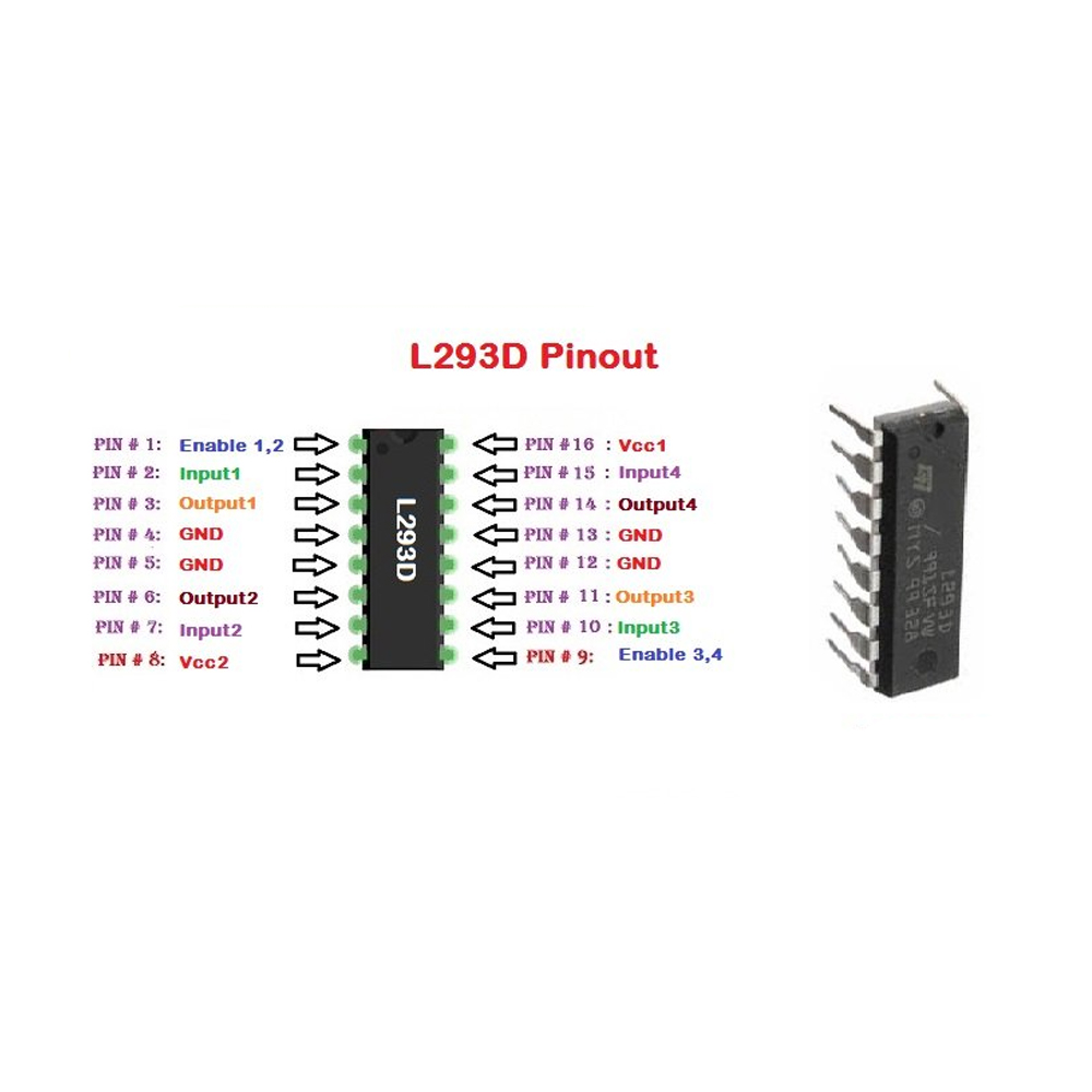 El L293D es un circuito integrado monolítico de alta potencia, diseñado para controlar cargas inductivas como motores de corriente continua (DC), motores paso a paso (PaP), relés y solenoides.