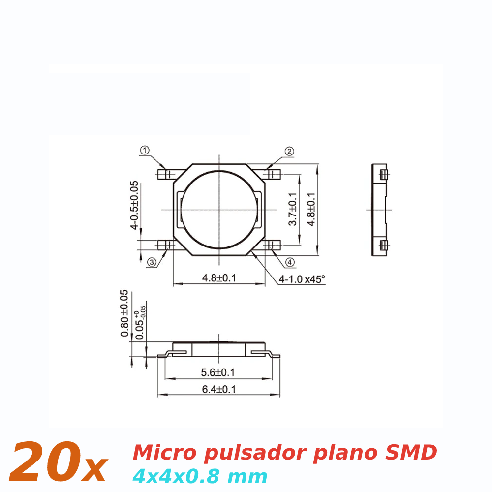 - 1x Micro Pulsador Táctil Plano SMD 4x4x0.8 mm SPST-NO 4 Pin