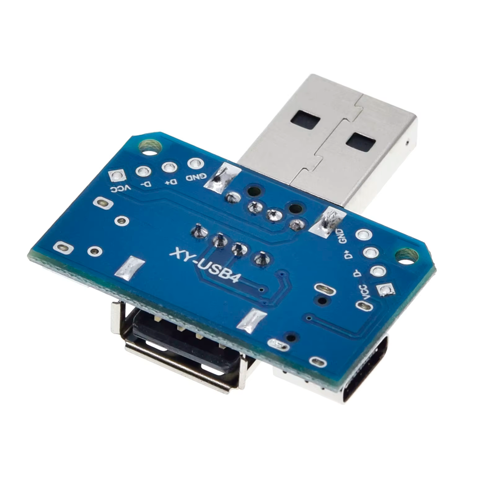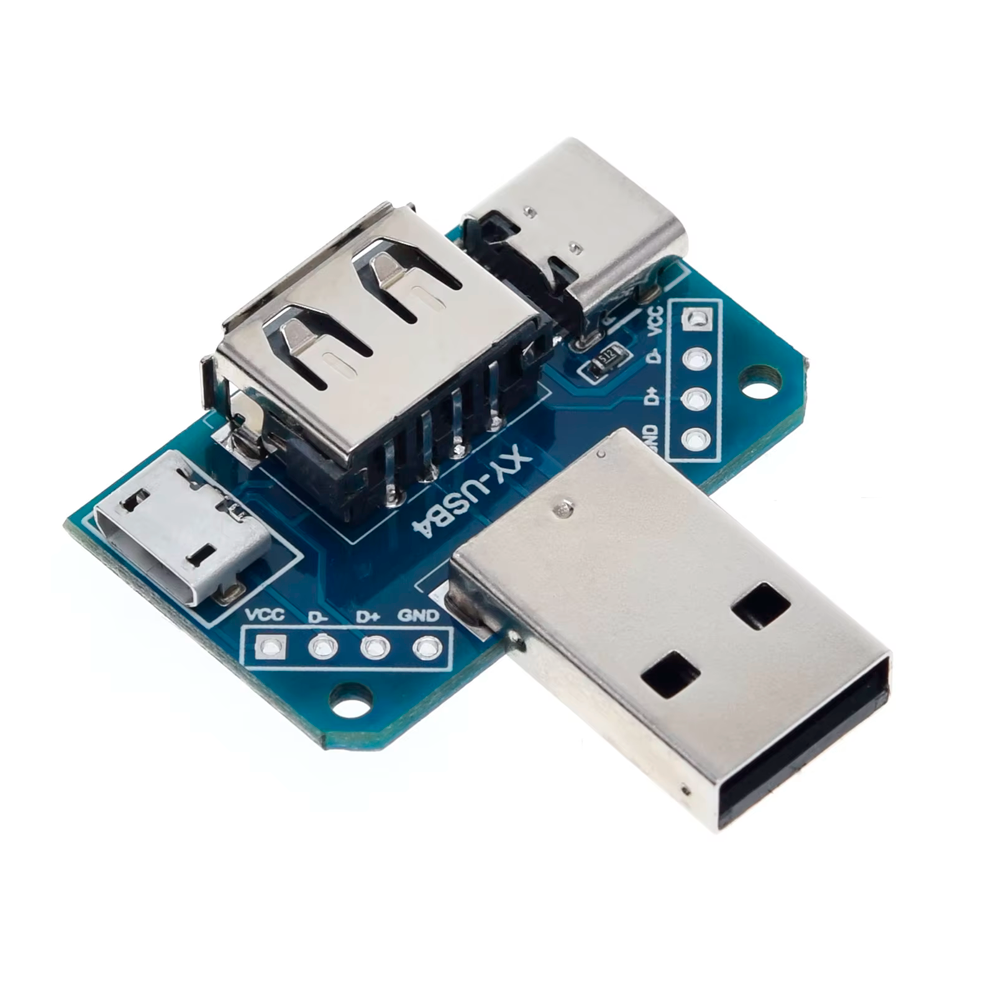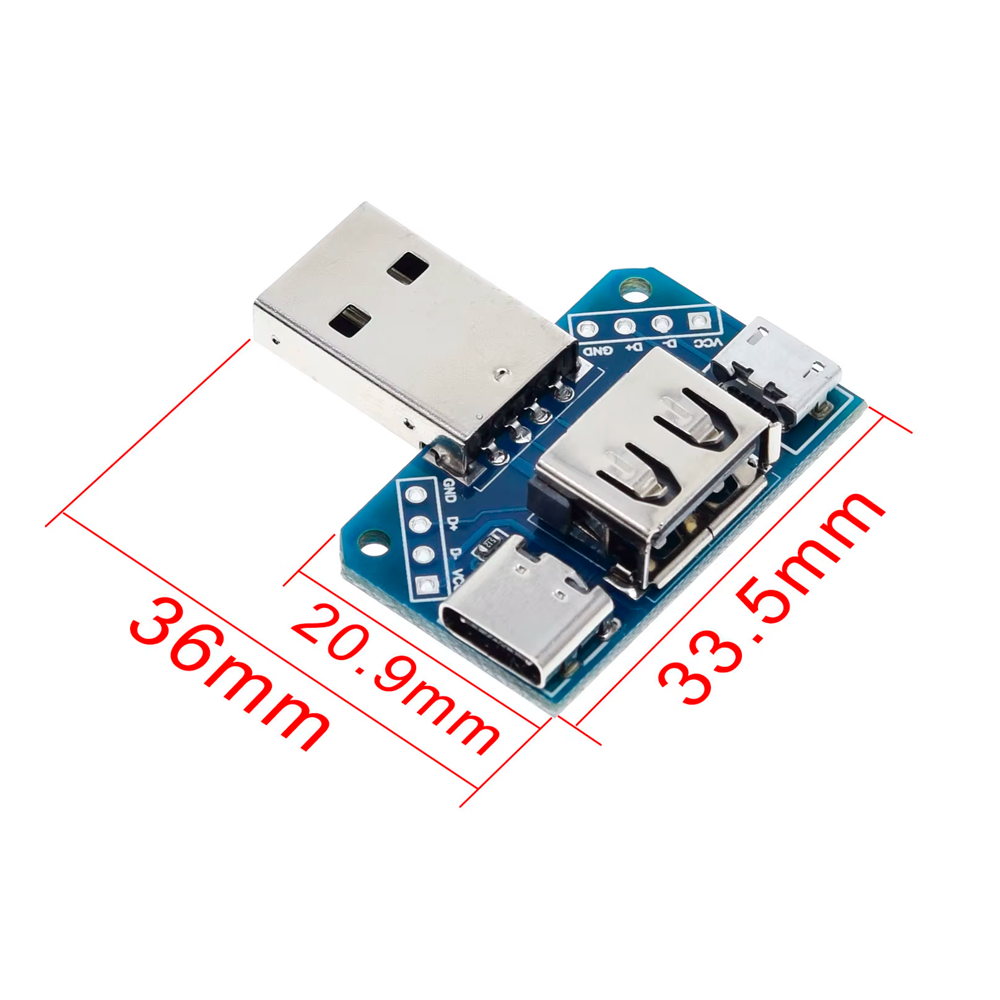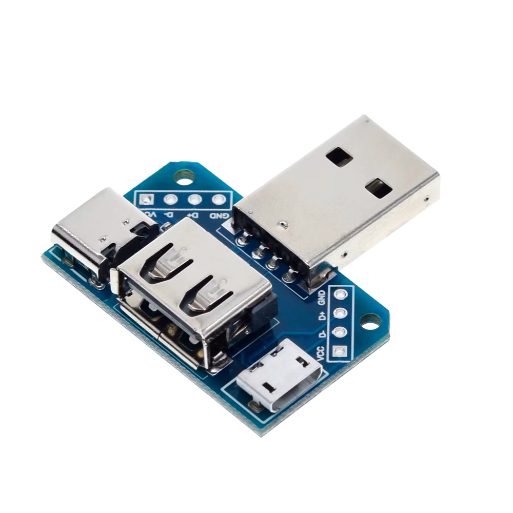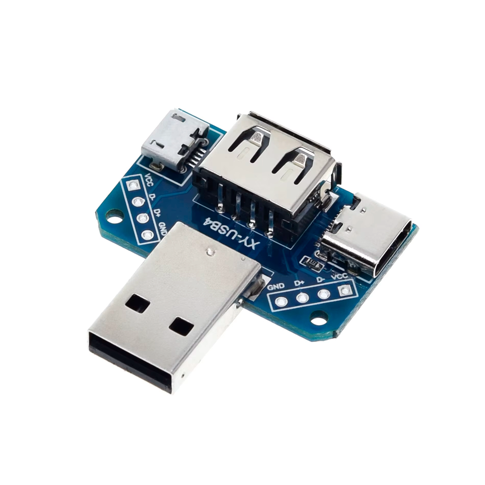 Placa adaptadora que convierte una entrada USB-A macho en tres salidas: USB-A, Micro-USB y USB-C hembra. Ideal para prototipos y testeo de conexiones.
