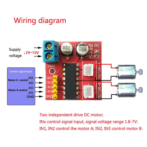 El módulo opera en un amplio rango de voltaje de alimentación (2 V a 10 V) y es compatible con señales de control de nivel lógico de 1.8 V a 7 V, lo que facilita su integración con microcontroladores como Arduino, ESP32 o Raspberry Pi. Además, incorpora un circuito de protección térmica (TSD) con histéresis para proteger el dispositivo contra sobrecalentamientos por bloqueo del motor.