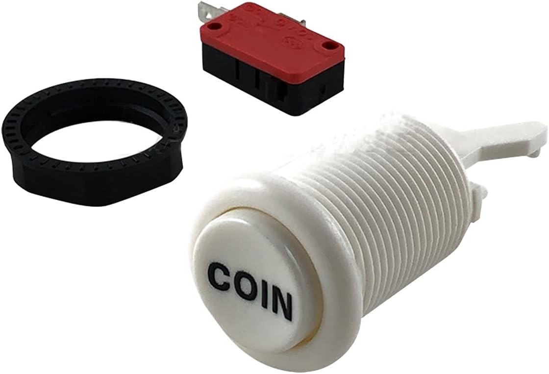 Fabricado en plástico resistente de color blanco, este botón está serigrafiado con la palabra «COIN», haciéndolo perfecto para la función de inserción de créditos. Se instala fácilmente en paneles de madera o metal, requiriendo un orificio de montaje de 28 mm.