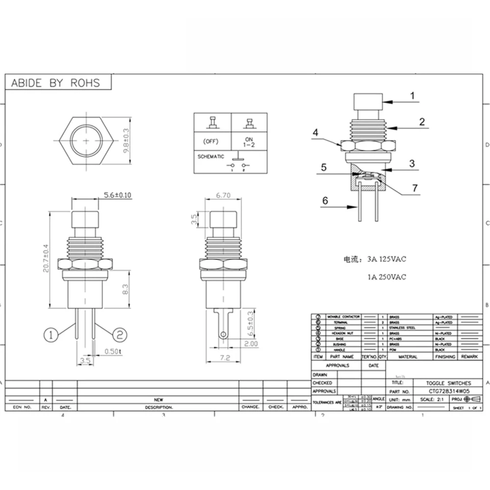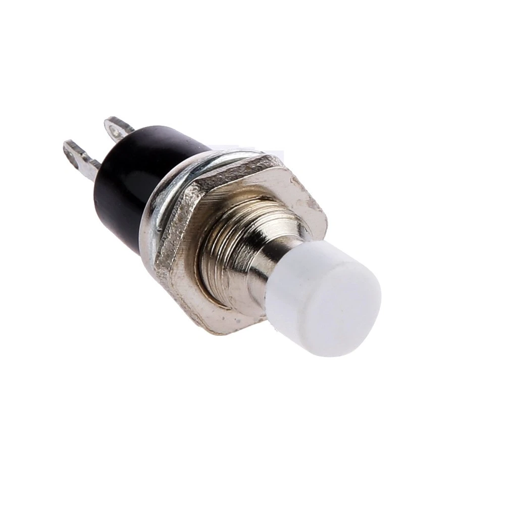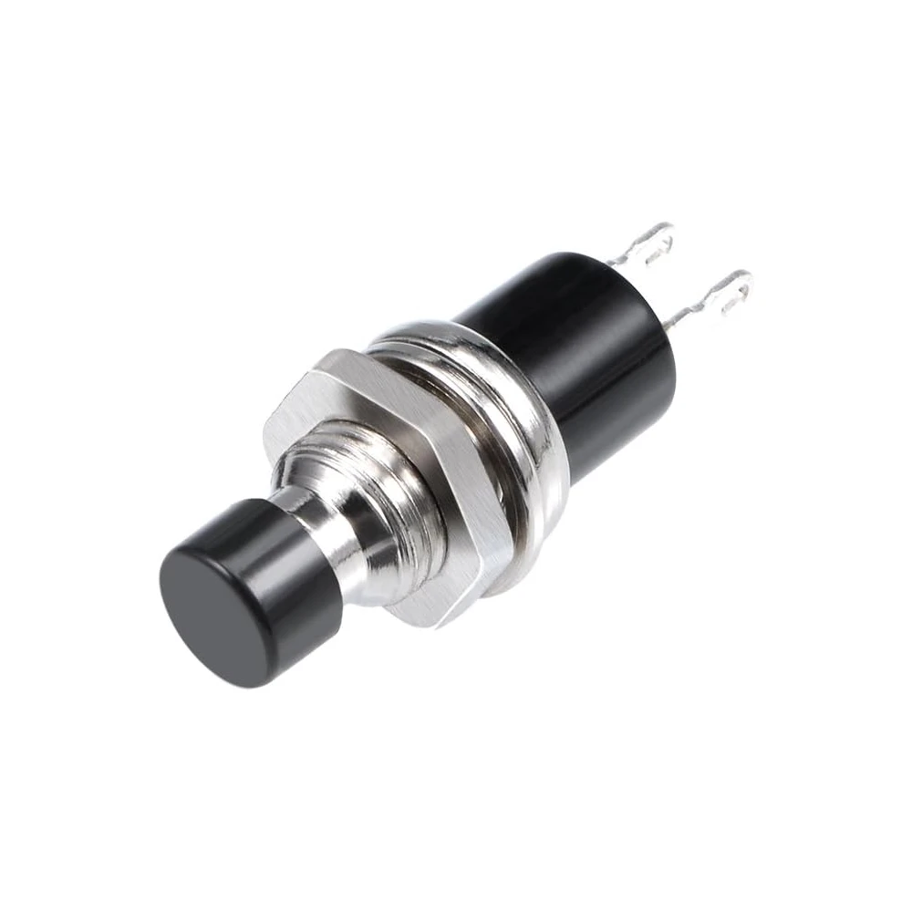 Soporta una carga de 2A/125v o 1A/220v. Consta de un contacto momentáneo normalmente abierto (NO) con retorno automático a la posición de reposo, es decir, solo deja pasar la corriente mientas ejercemos presión sobre la tecla, una vez dejamos de presionar, el mecanismo vuelve a su posición de reposo inicial con la ayuda de un muelle. Para su montaje solo se necesita hacer un agujero de 7mm de diámetro, se puede colocar en cualquier panel que no tenga más de 2mm de grosor y es muy fácil de ajustar gracias a su tuerca de ajuste.