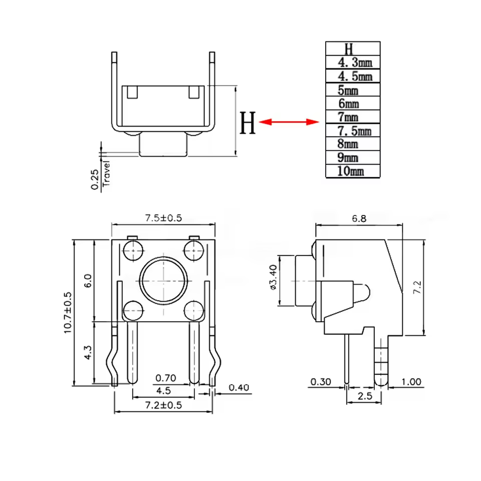 Con una vida útil certificada de 100.000 ciclos y una amplia tolerancia térmica, es un componente ideal para interfaces de usuario en robótica, botones de reset industriales, periféricos informáticos y cualquier proyecto de electrónica que requiera un pulsador lateral de perfil alto y gran fiabilidad.