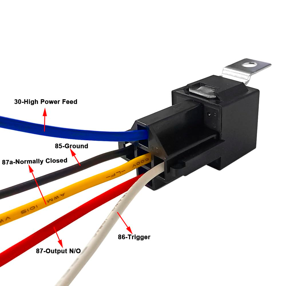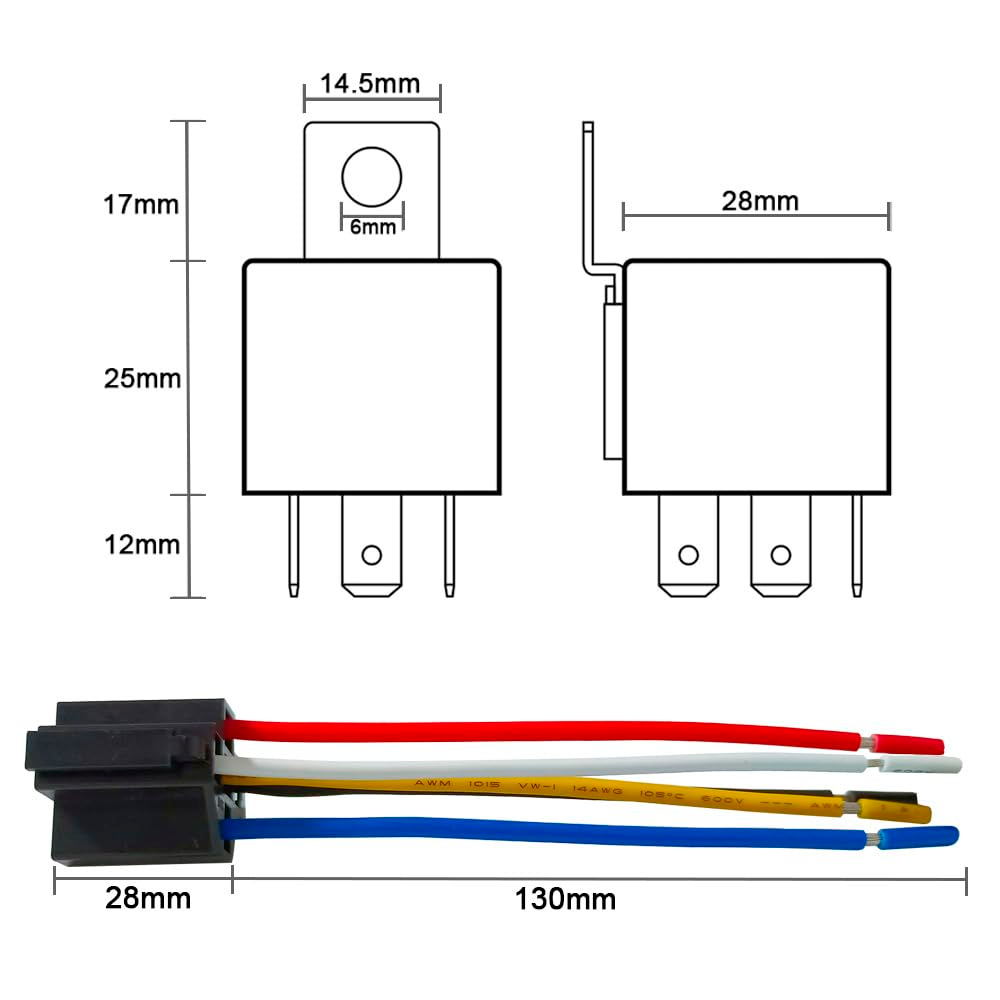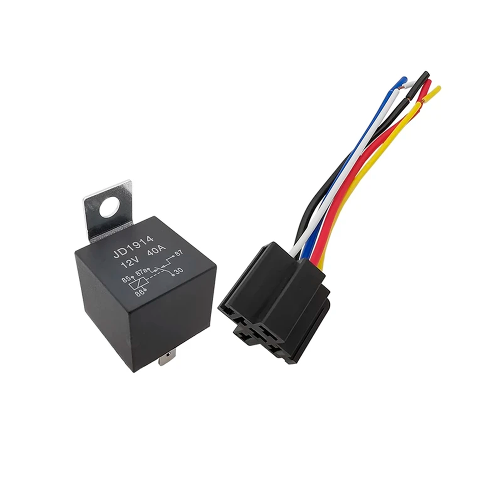 Este relé automotriz de 12 V y 40 A es un componente esencial para la gestión de circuitos eléctricos en vehículos. Incluye un conector o zócalo apropiado para una instalación sencilla y segura.