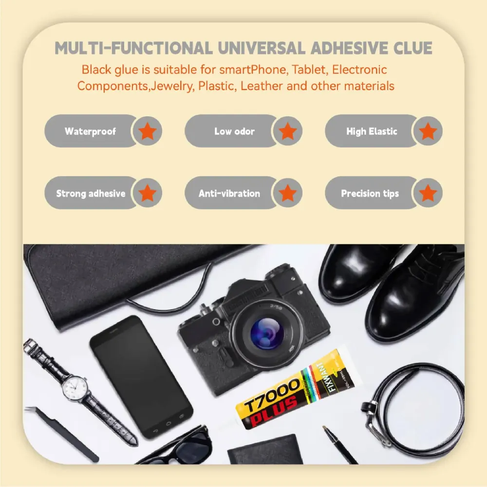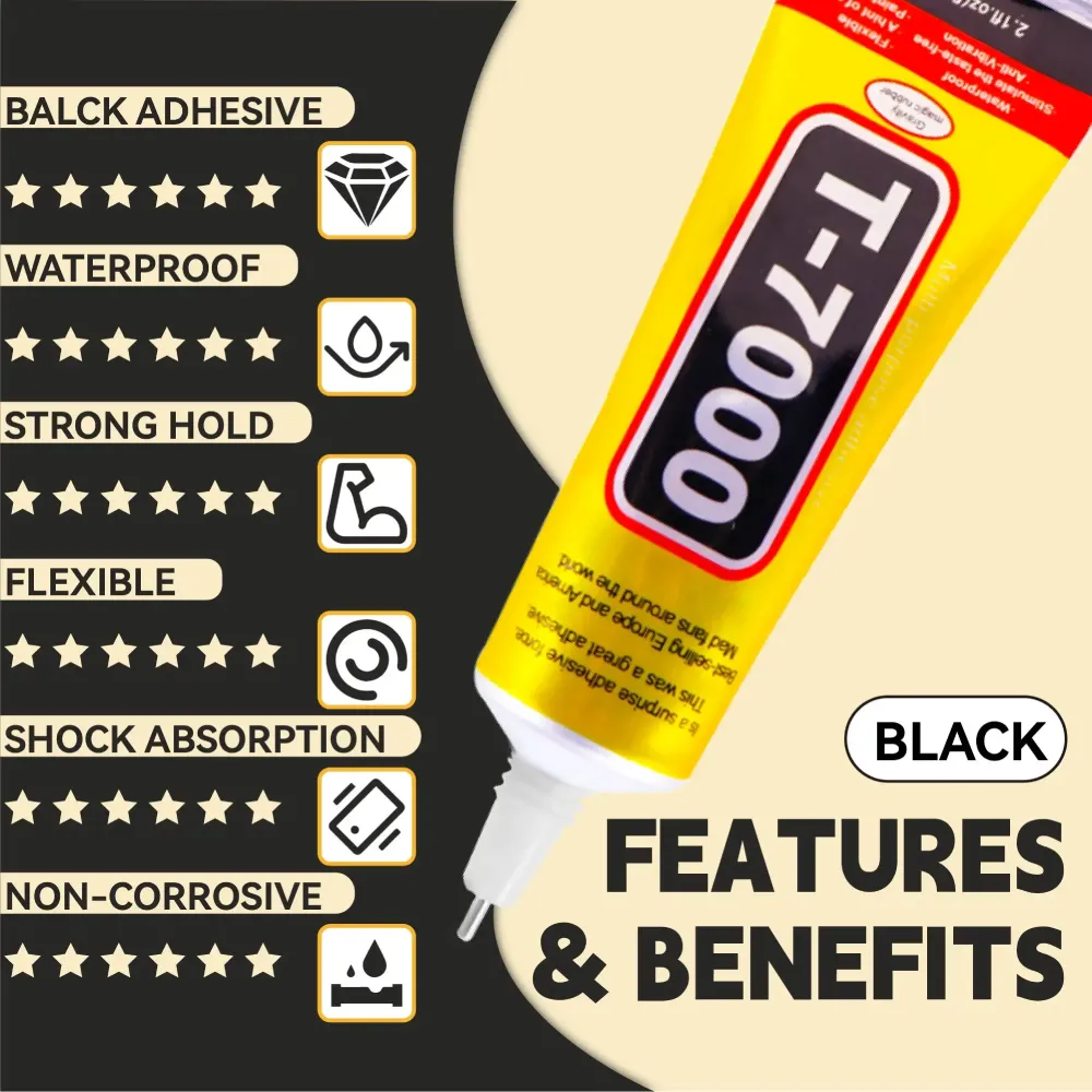 El adhesivo T-7000 es una solución profesional de color negro, especialmente formulada para trabajos de precisión en electrónica, como la reparación de smartphones y tablets.